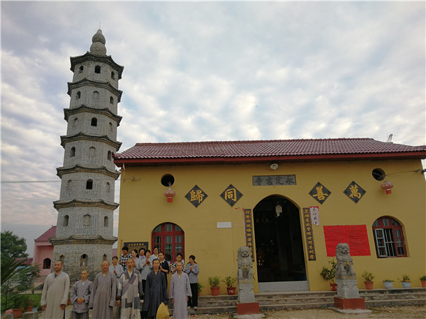 早上隊員們照樣4點多起床在永定古寺參加早課,早課后演定法師帶領居士們拜塔、繞塔。早餐后與永定古寺的主持果華法師等人愉快合影,感恩果華法師等人的熱情款待。七點半出發,開始了今天的行腳旅程。上午太陽雖然很大,但現在過了白露,也不覺得特別的熱和曬。路上,看到一只因車禍橫死的小麻雀,演定法師慈悲的將它掩埋并誦往生咒超度。