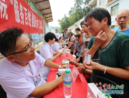圖為國(guó)慶節(jié)前夕,該縣茭湖鄉(xiāng)謝溪村農(nóng)民在村部門口接受健康教育、政策咨詢、為留守兒童送溫暖及醫(yī)療義診服務(wù)的情景。